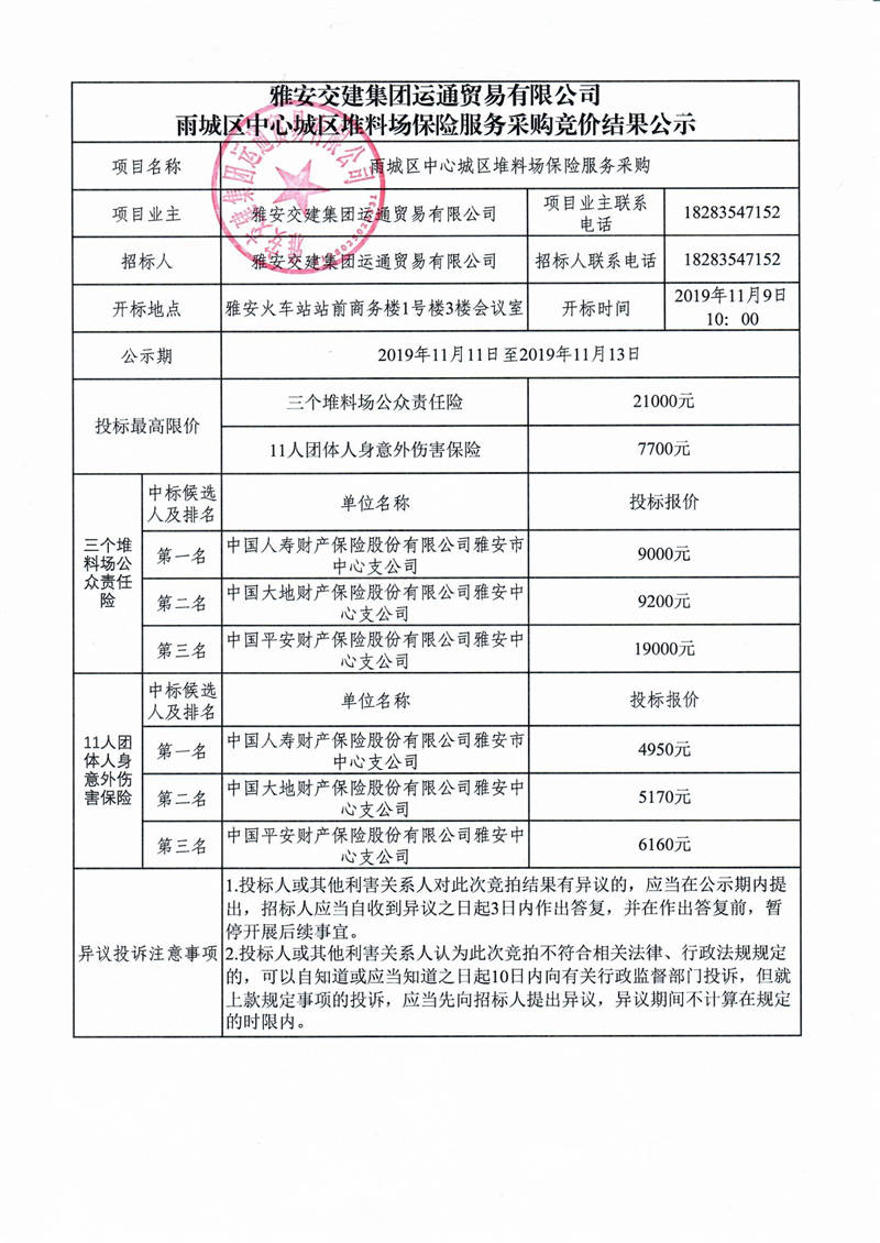 雅安交建集團(tuán)運(yùn)通貿(mào)易有限公司雨城區(qū)中心城區(qū)堆料場(chǎng)保險(xiǎn)服務(wù)采購(gòu)競(jìng)價(jià)結(jié)果公示