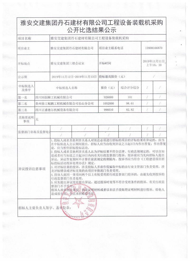 雅安交建集團丹石建材有限公司工程設備裝載機采購公開比選結果公示