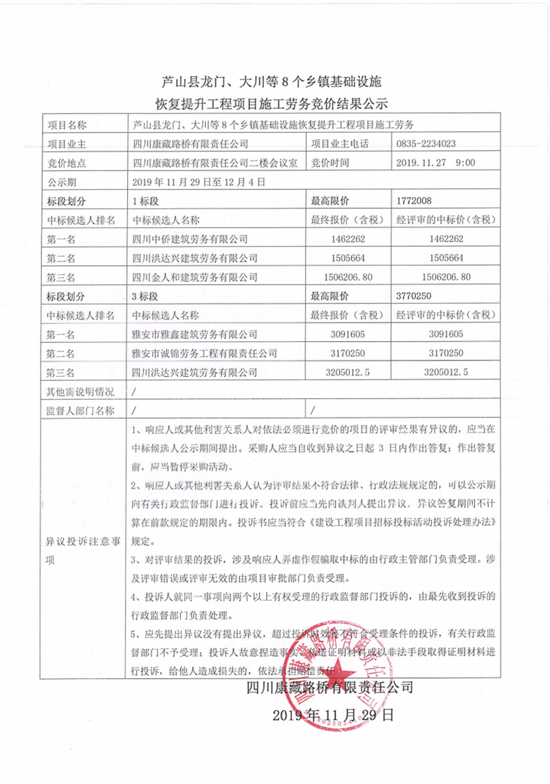 四川康藏路橋有限責任公司蘆山縣龍門、大川等8個鄉(xiāng)鎮(zhèn)基礎設施恢復提升工程項目施工勞務競價結果公示