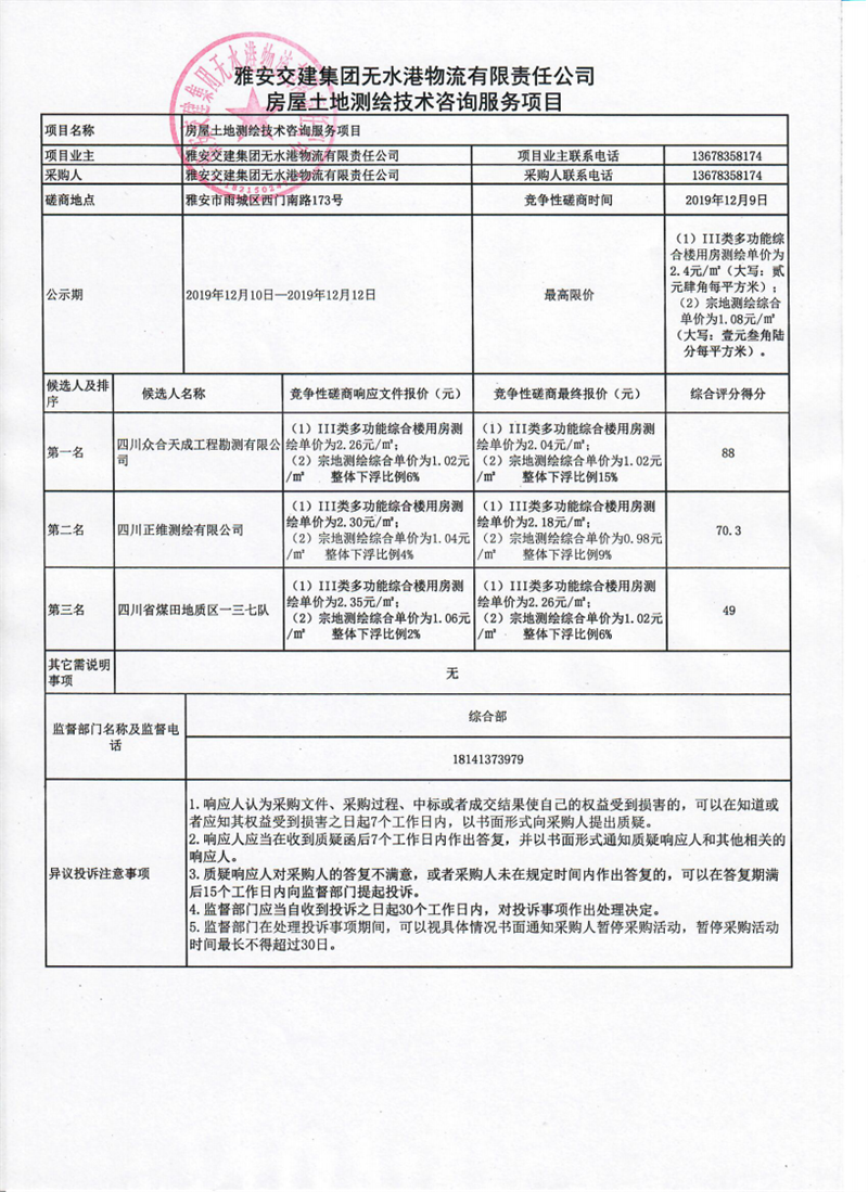 雅安交建集團(tuán)無水港物流有限責(zé)任公司房屋土地測繪技術(shù)咨詢服務(wù)項目競爭性磋商結(jié)果公示