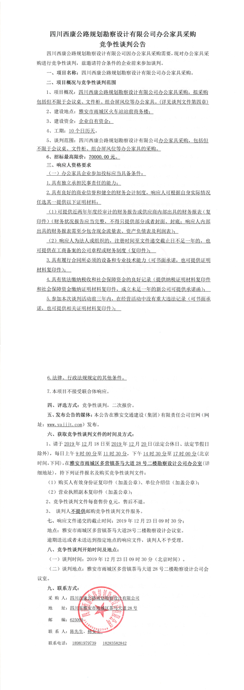 四川西康公路規(guī)劃勘察設(shè)計(jì)有限公司辦公家具采購(gòu)競(jìng)爭(zhēng)性談判公告