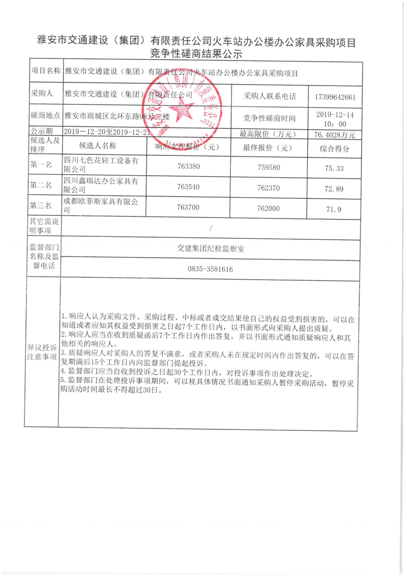 雅安市交通建設(shè)(集團(tuán))有限責(zé)任公司火車(chē)站辦公樓辦公家具采購(gòu)項(xiàng)目競(jìng)爭(zhēng)性磋商結(jié)果公示