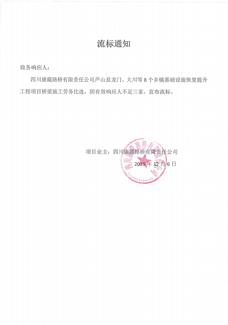 四川康藏路橋有限責任公司蘆山縣龍門、大川等8個鄉(xiāng)鎮(zhèn)基礎(chǔ)設(shè)施恢復提升工程項目橋梁施工勞務比選流標通知