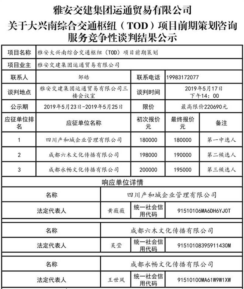 雅安交建集團運通貿(mào)易有限公司關(guān)于大興南綜合樞紐(TOD)項目前期策劃咨詢服務(wù)競爭性談判結(jié)果公司