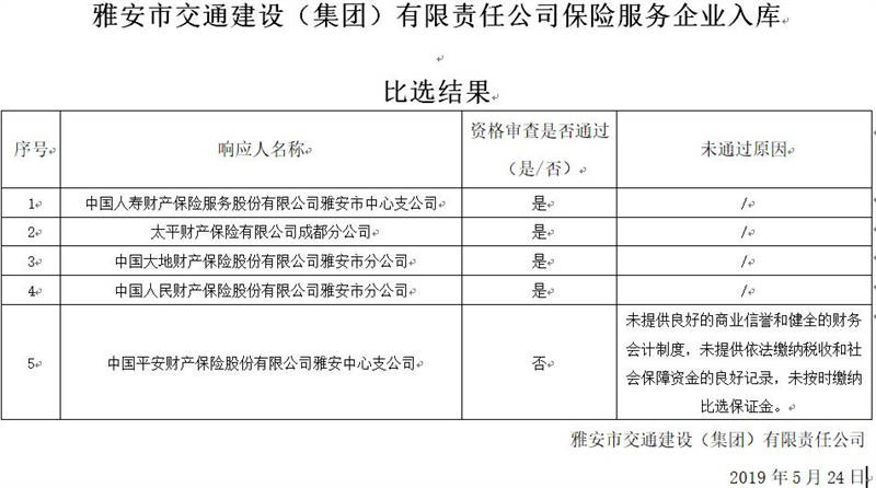 雅安市交通建設(集團)有限責任公司保險服務企業(yè)入庫比選結果公示
