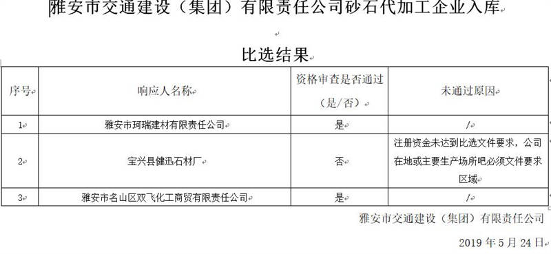 雅安市交通建設(集團)有限責任公司砂石代加工企業(yè)入庫比選結(jié)果公示