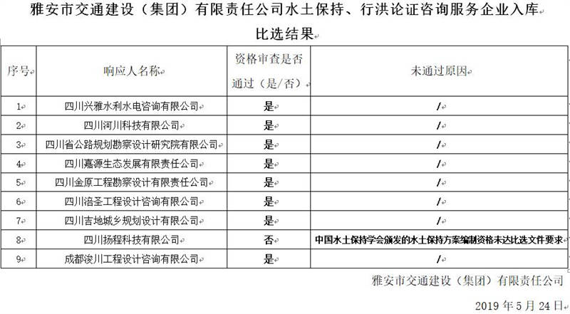 雅安市交通建設(shè)(集團)有限責(zé)任公司水土保持、行洪論證咨詢服務(wù)企業(yè)入庫比選結(jié)果公示