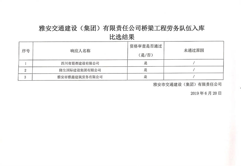 雅安交通建設(集團)有限責任公司橋梁工程勞務隊伍入庫比選結(jié)果