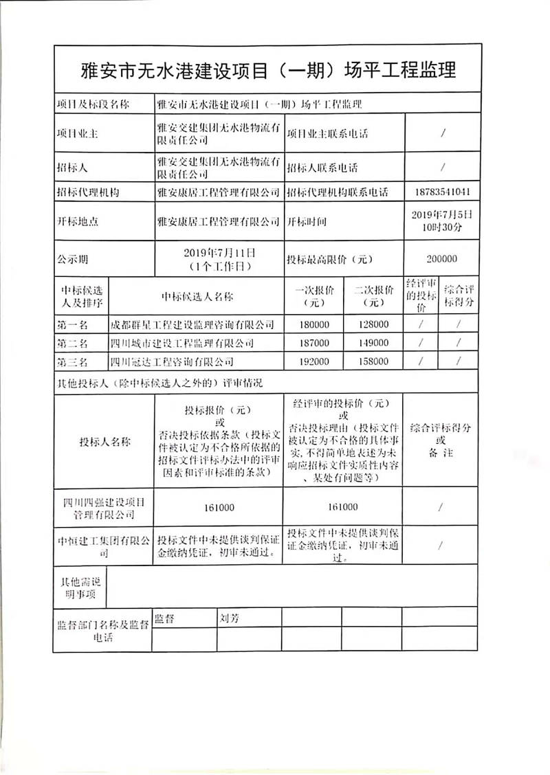 雅安交建集團(tuán)無水港物流有限責(zé)任公司雅安市無水港建設(shè)項(xiàng)目(一期)場平工程監(jiān)理競爭性談判結(jié)果公示