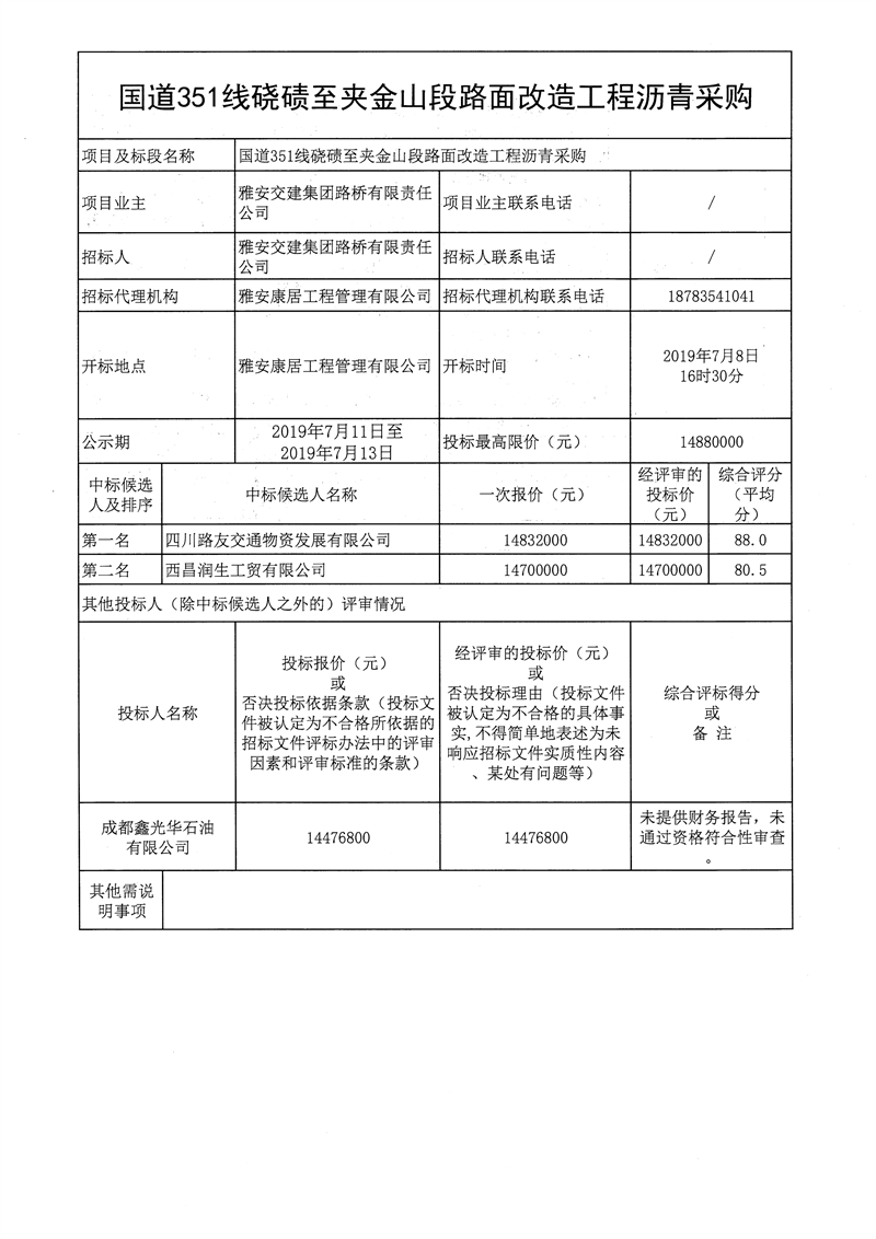 雅安交建集團路橋有限責任公司國道351線磽磧至夾金山段路面改造工程瀝青采購公開招標結(jié)果公示