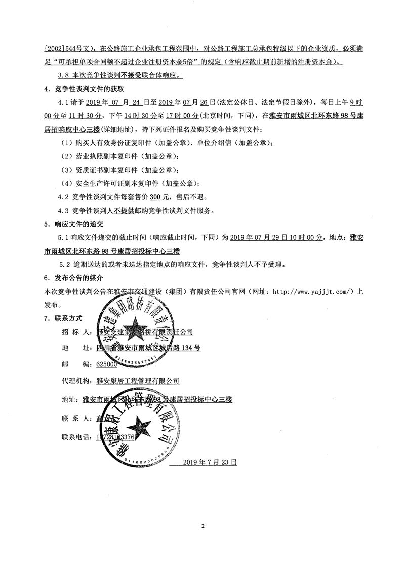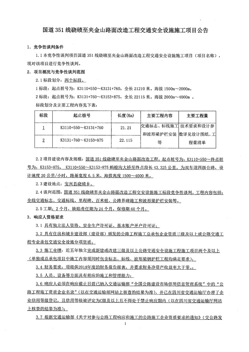 雅安交建集團路橋有限責(zé)任公司國道351線磽磧至夾金山段路面改造工程交通安全設(shè)施施工項目競爭性談判公告