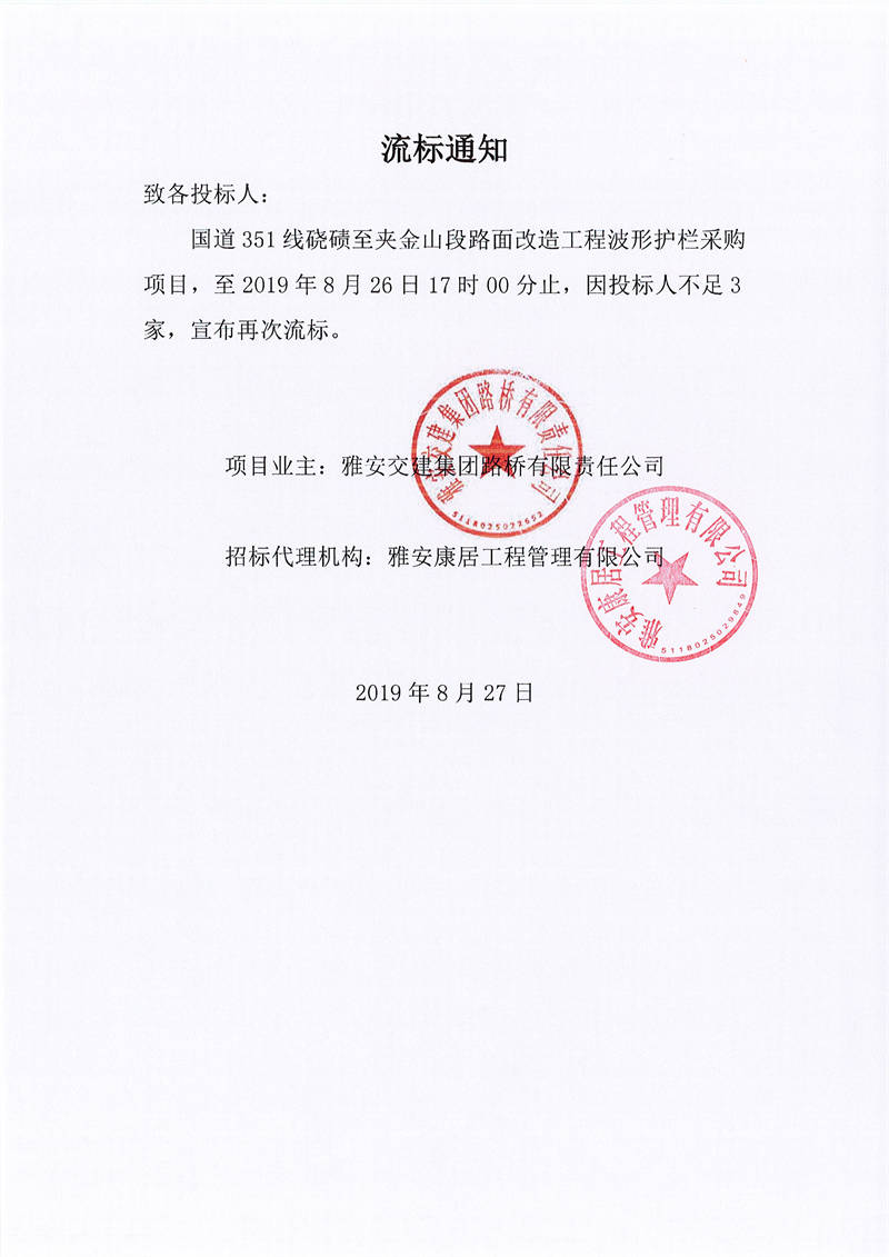 雅安交建集團路橋有限責(zé)任公司國道351線蹺磧至夾金山段路面改造工程波形護欄采購項目流標(biāo)通知