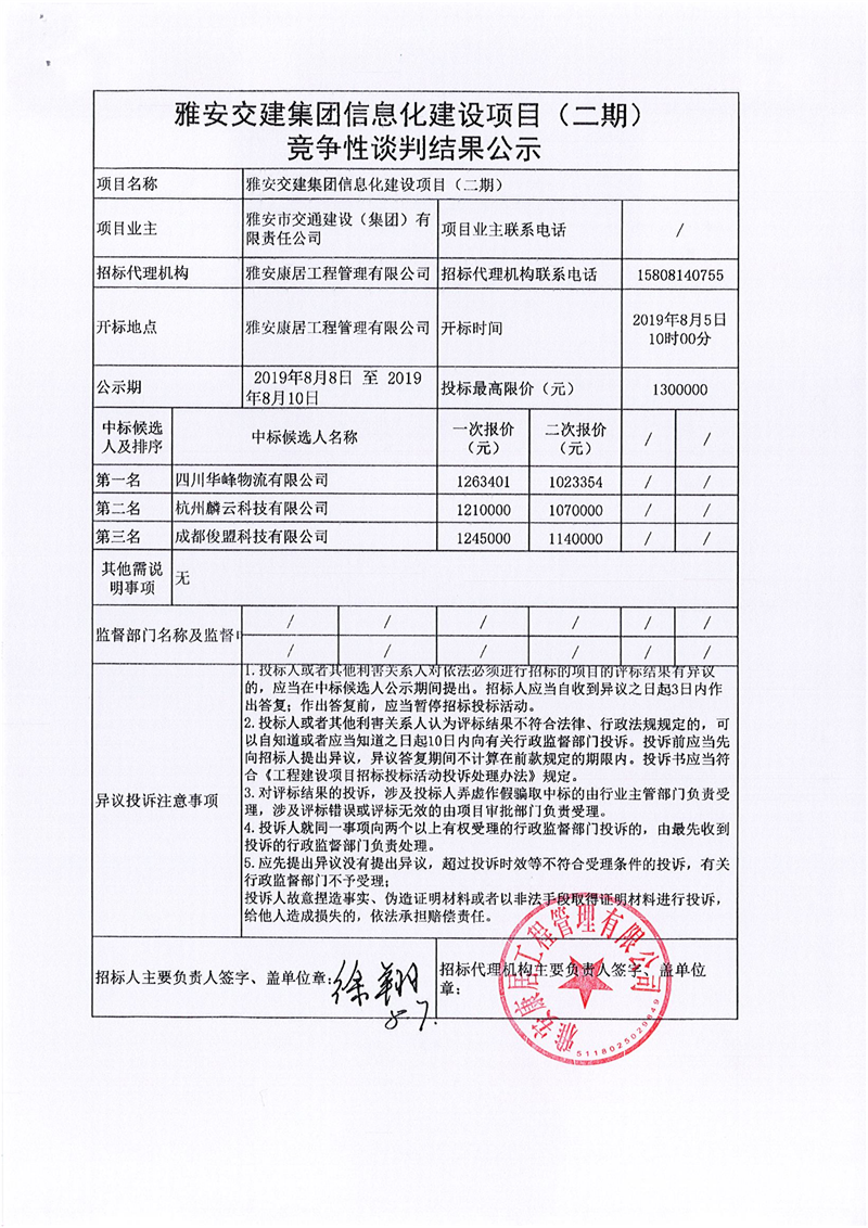 雅安交建集團(tuán)信息化建設(shè)項(xiàng)目(二期)競爭性談判結(jié)果公示