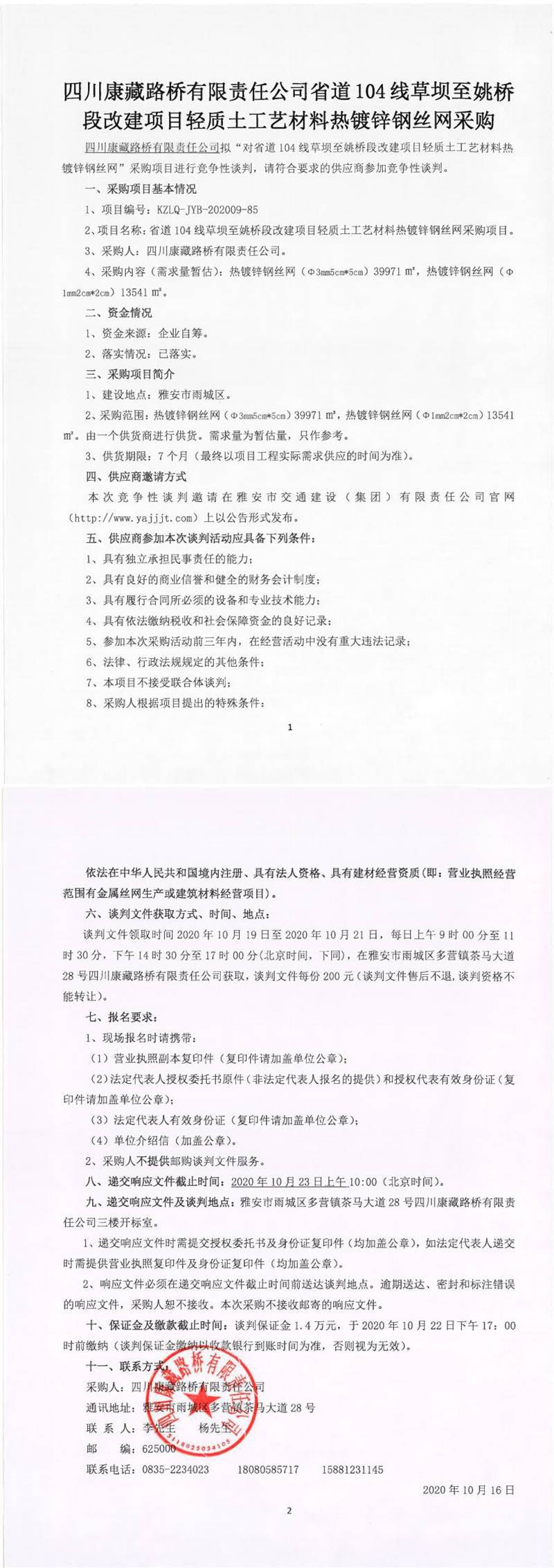 四川康藏路橋有限責(zé)任公司省道104線草壩至姚橋段改建項目輕質(zhì)土工藝材料熱鍍鋅鋼絲網(wǎng)采購競爭性談判公告