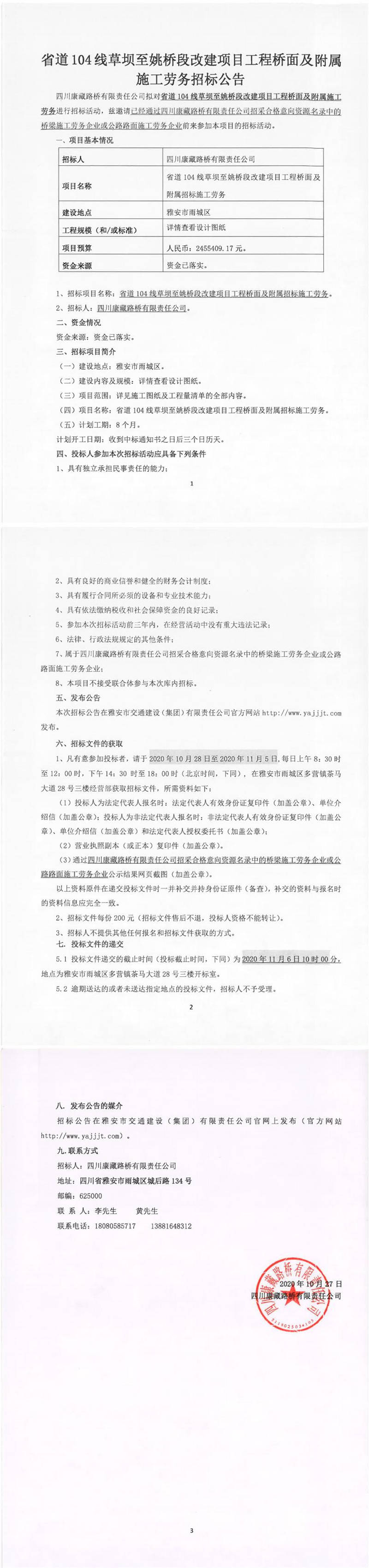 四川康藏路橋有限責(zé)任公司省道104線草壩至姚橋段改建項(xiàng)目工程橋面及附屬施工勞務(wù)招標(biāo)公告