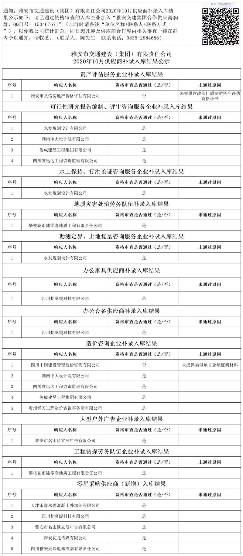 雅安市交通建設(shè)(集團)有限責任公司2020年10月供應商補錄入庫結(jié)果公示