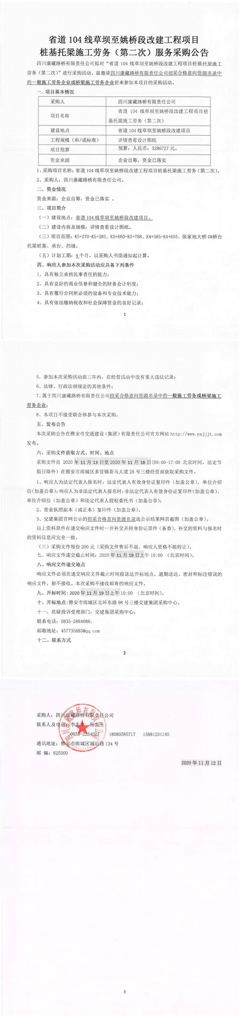 四川康藏路橋有限責任公司省道104線草壩至姚橋段改建工程項目樁基托梁施工勞務(第二次)服務采購公告