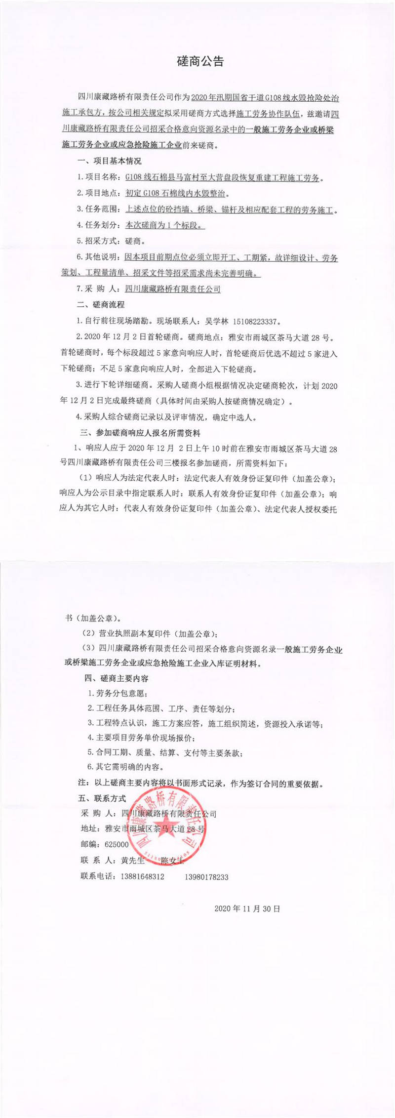 四川康藏路橋有限責任公司G108線石棉縣馬富村至大營盤段恢復(fù)重建工程施工勞務(wù)磋商公告