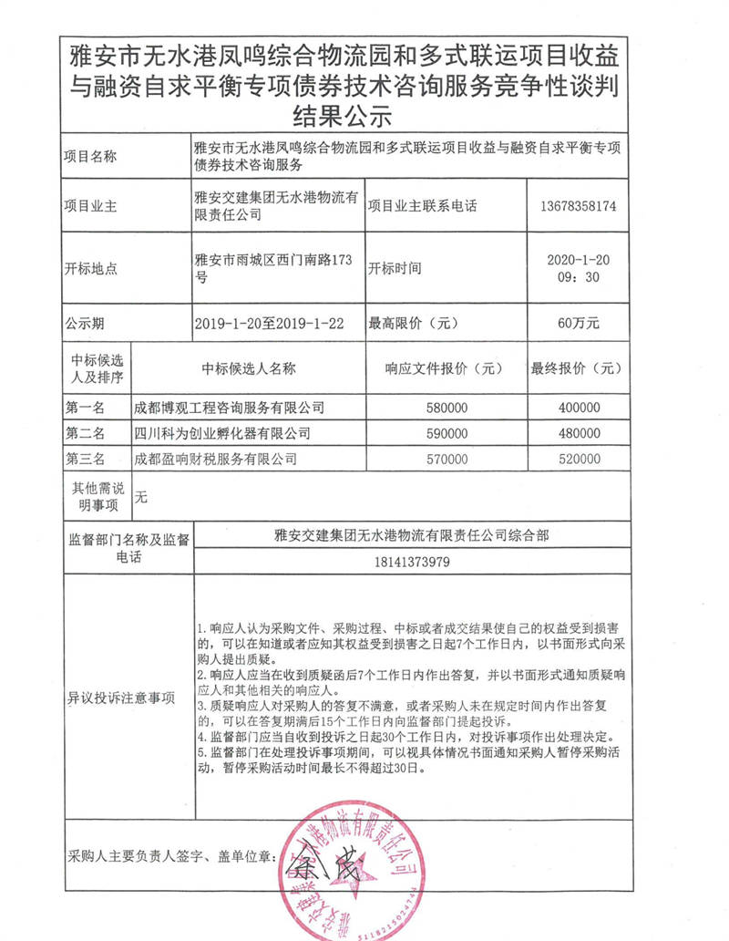 雅安市無(wú)水港鳳鳴綜合物流園和多式聯(lián)運(yùn)項(xiàng)目收益與融資自求平衡專項(xiàng)債券技術(shù)咨詢服務(wù)競(jìng)爭(zhēng)性談判結(jié)果公示