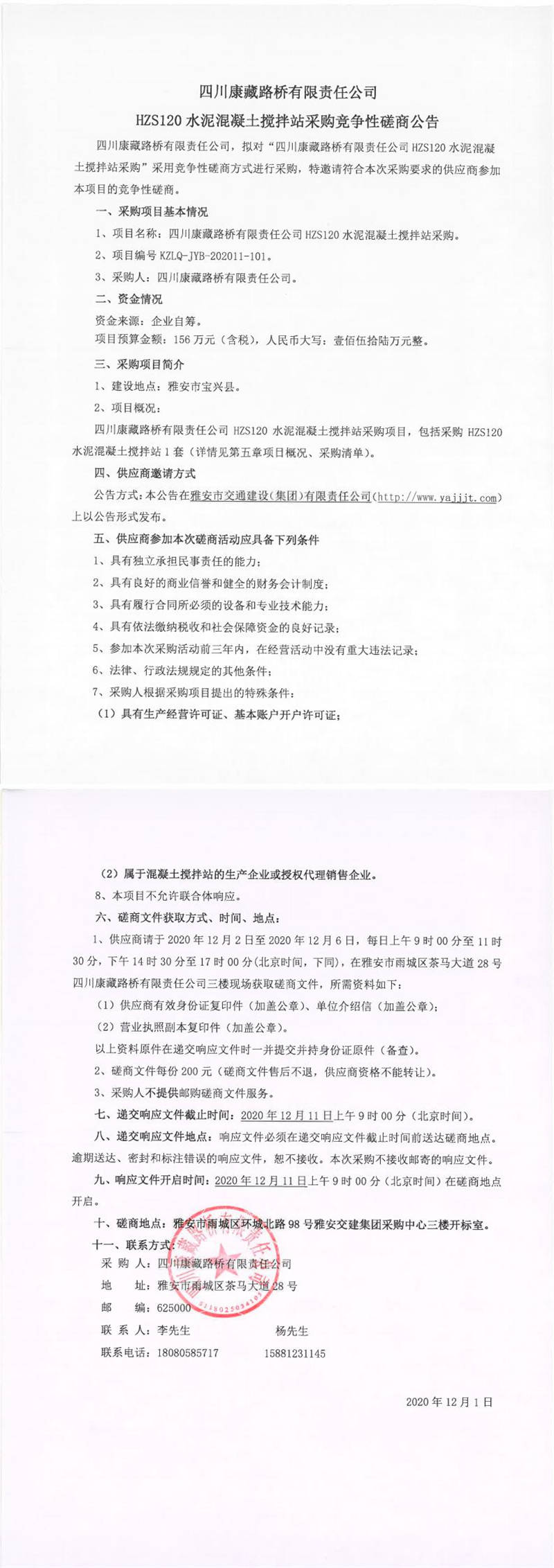 四川康藏路橋有限責任公司HZS120水泥混凝土攪拌站采購競爭性磋商公告