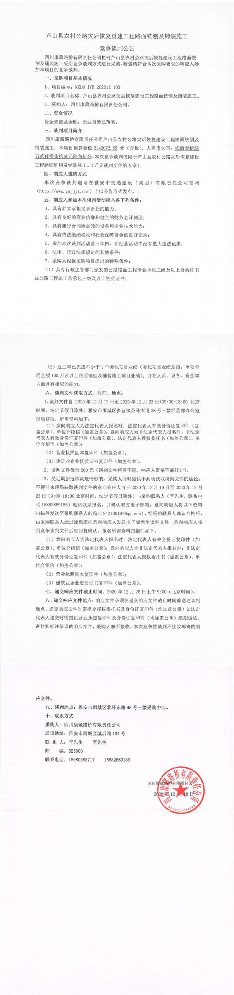 四川康藏路橋有限責(zé)任公司蘆山縣農(nóng)村公路災(zāi)后恢復(fù)建設(shè)工程路面銑刨及鋪裝施工競(jìng)爭(zhēng)談判公告