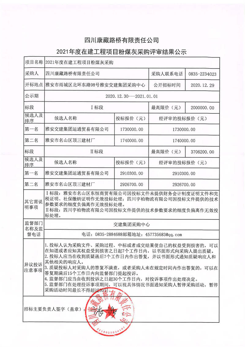 四川康藏路橋有限責任公司2021年度在建工程項目粉煤灰采購評審結果公示
