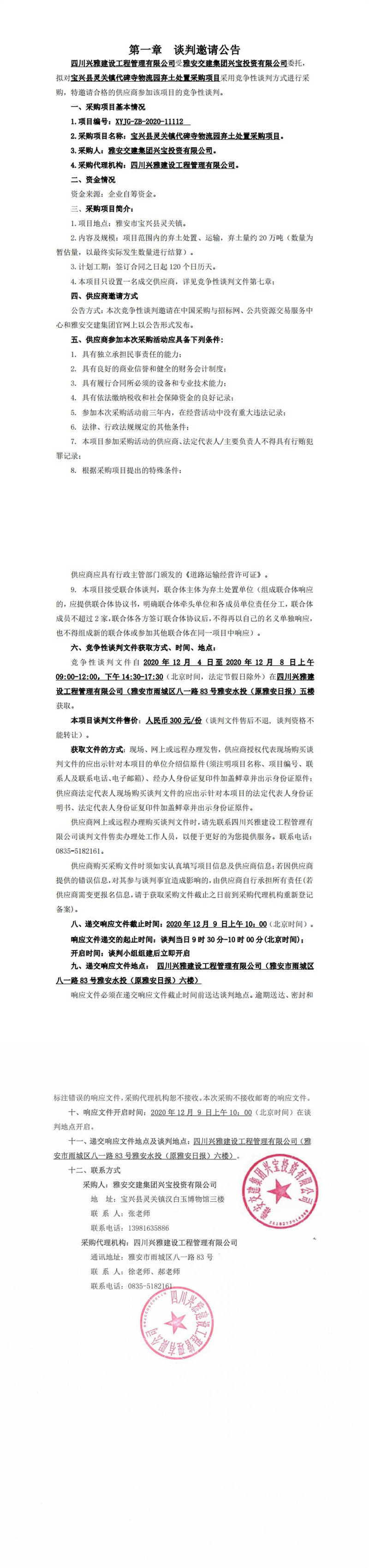 雅安交建集團(tuán)興寶投資有限公司寶興縣靈關(guān)鎮(zhèn)代碑寺物流園棄土處置采購(gòu)項(xiàng)目談判公告