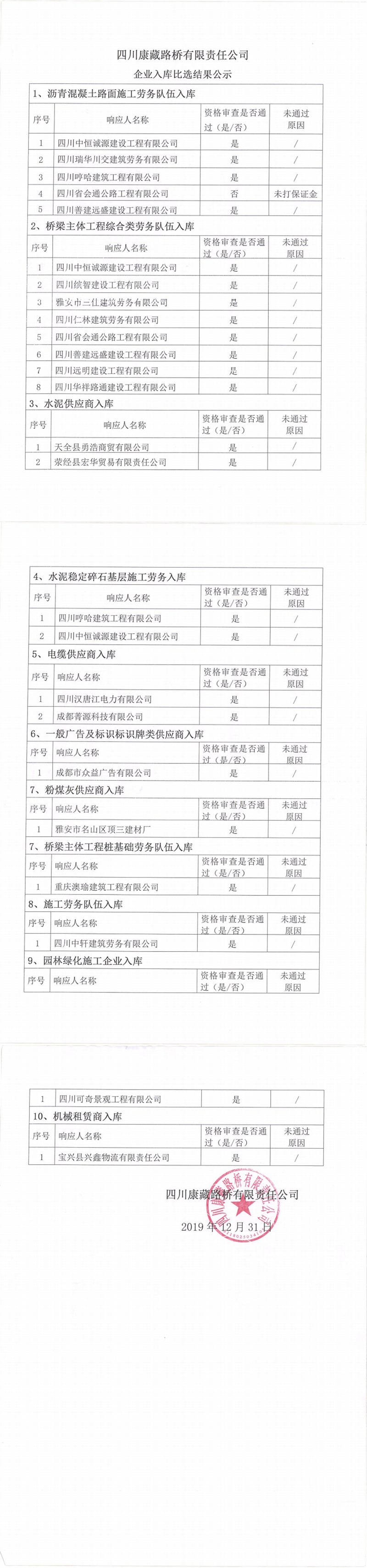 四川康藏路橋有限責任公司企業(yè)入庫比選結(jié)果公示