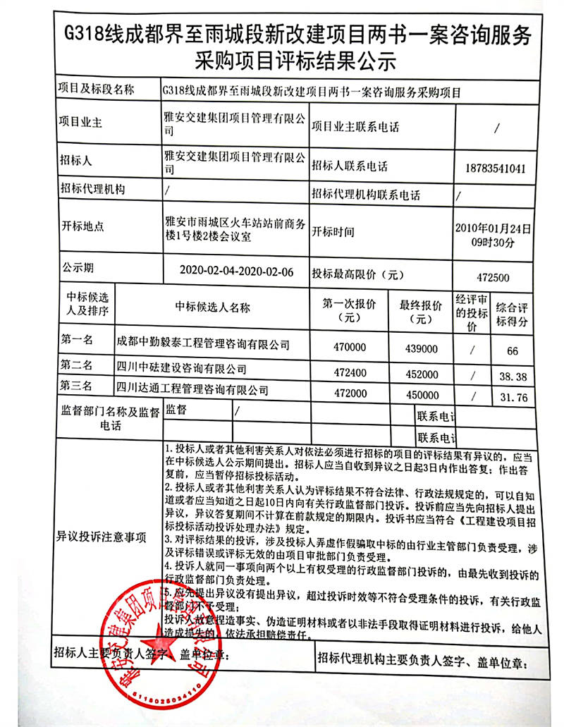 雅安交建集團(tuán)項(xiàng)目管理有限公司G318線成都界至雨城段新改建項(xiàng)目?jī)蓵话缸稍兎⻊?wù)采購(gòu)項(xiàng)目評(píng)標(biāo)結(jié)果公示
