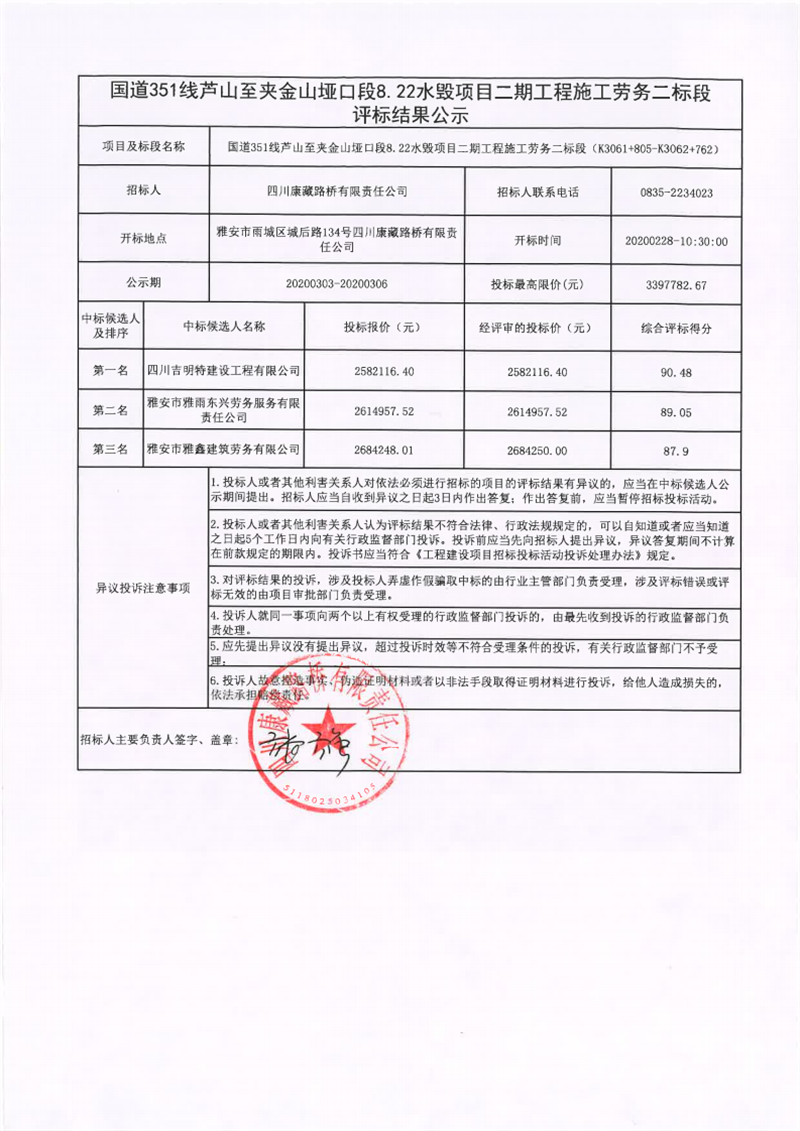 四川康藏路橋有限責(zé)任公司國(guó)道351線(xiàn)蘆山至夾金山埡口段8.22水毀項(xiàng)目二期工程施工勞務(wù)二標(biāo)段評(píng)標(biāo)結(jié)果公示