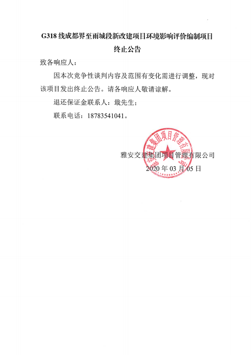 雅安交建集團項目管理有限公司G318線成都界至雨城段新改建項目環(huán)境影響評價編制項目終止公告