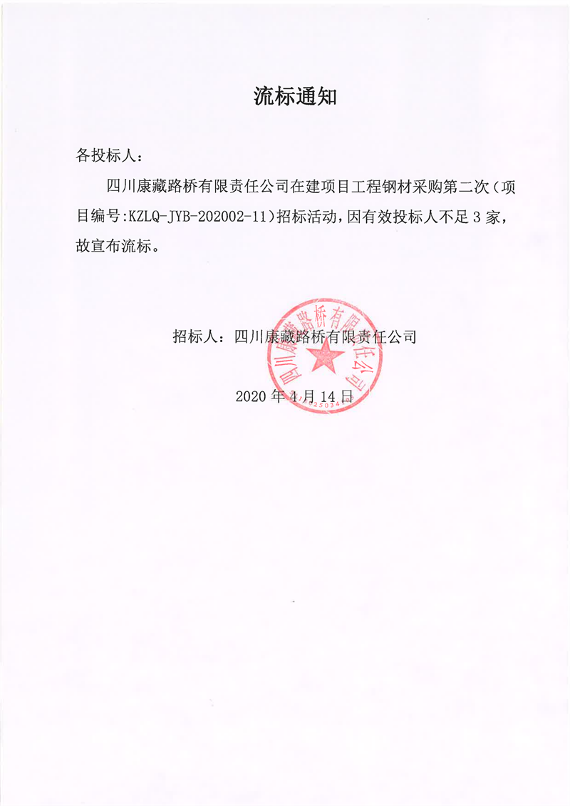 四川康藏路橋有限責(zé)任公司在建項目工程鋼材采購第二次流標(biāo)通知