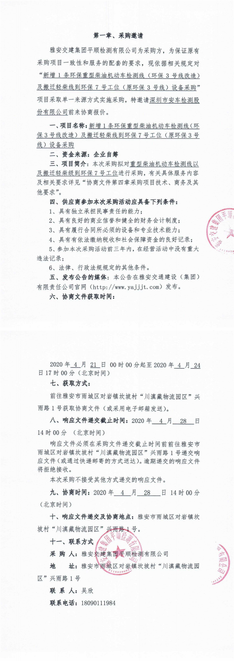 雅安交建集團(tuán)平順檢測(cè)有限公司新增1條環(huán)保重型柴油機(jī)動(dòng)車(chē)檢測(cè)線(環(huán)保3號(hào)線改造)及搬遷輕柴線到環(huán)保7號(hào)工位(原環(huán)保3號(hào)線)設(shè)備采購(gòu)單一來(lái)源協(xié)商公告