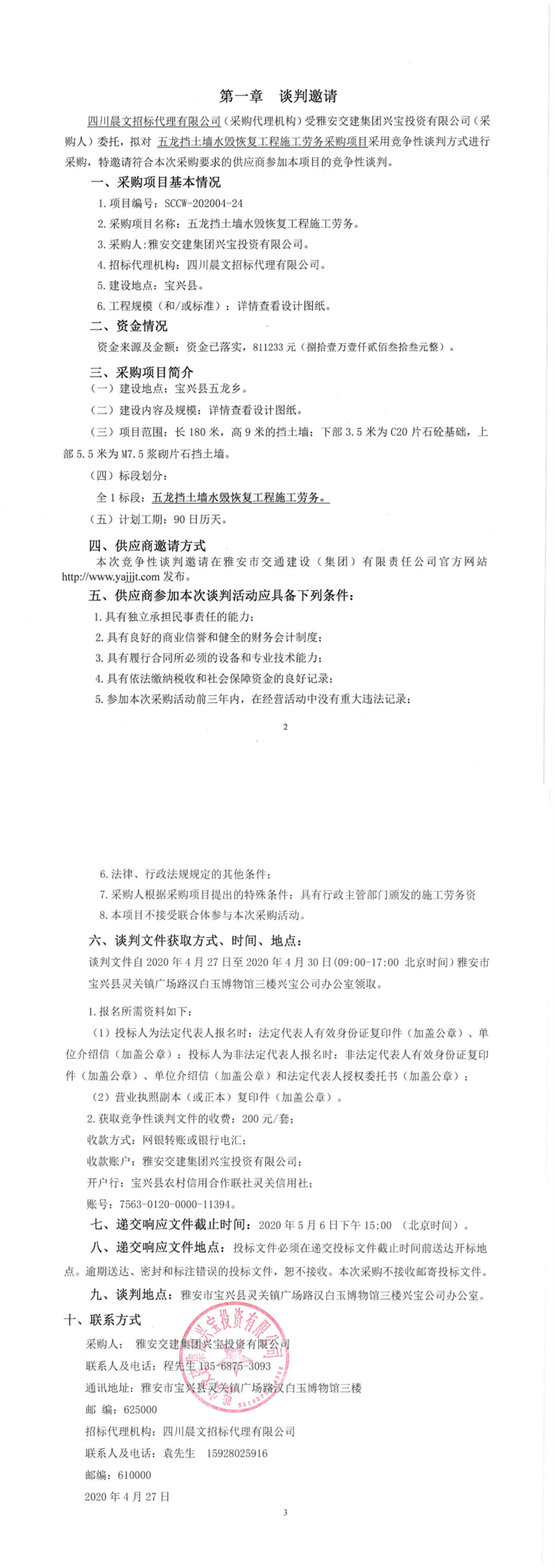 雅安交建集團(tuán)興寶投資有限公司五龍擋土墻水毀恢復(fù)工程施工勞務(wù)采購項目競爭性談判公告