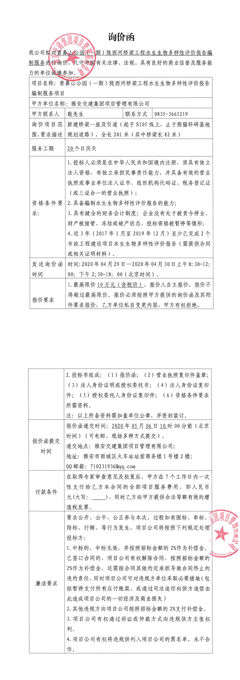 雅安交建集團項目管理有限公司青鼻山公園(一期)隴西河橋梁工程水生生物多樣性評價報告編制服務(wù)項目詢價函