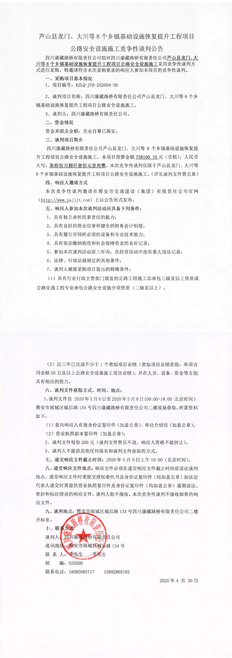 四川康藏路橋有限責任公司蘆山縣龍門、大川等8個鄉(xiāng)鎮(zhèn)基礎(chǔ)設(shè)施恢復(fù)提升工程項目公路安全設(shè)施施工競爭性談判公告