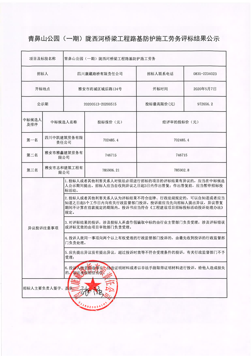 四川康藏路橋有限責任公司青鼻山公園(一期)隴西河橋梁工程路基防護施工勞務(wù)評標結(jié)果公示