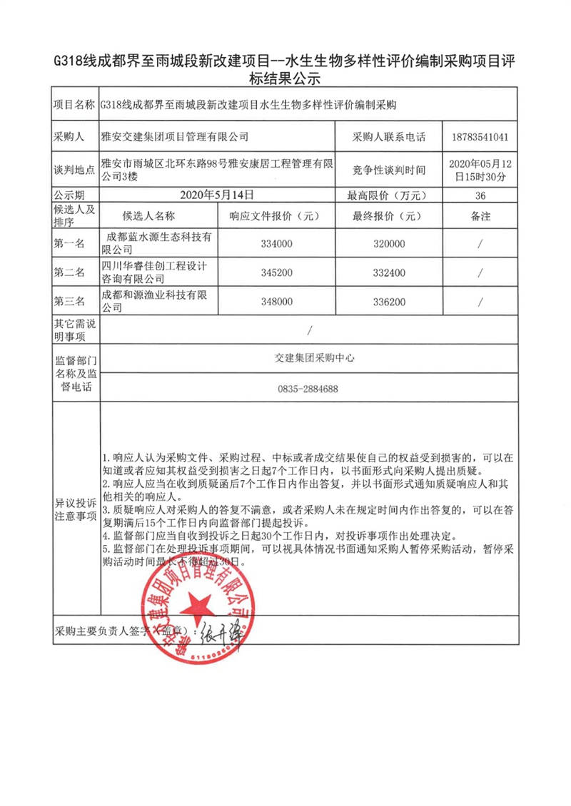 雅安交建集團(tuán)項(xiàng)目管理有限公司G318線(xiàn)成都界至雨城段新改建項(xiàng)目水生生物多樣性評(píng)價(jià)編制采購(gòu)項(xiàng)目評(píng)標(biāo)結(jié)果公示