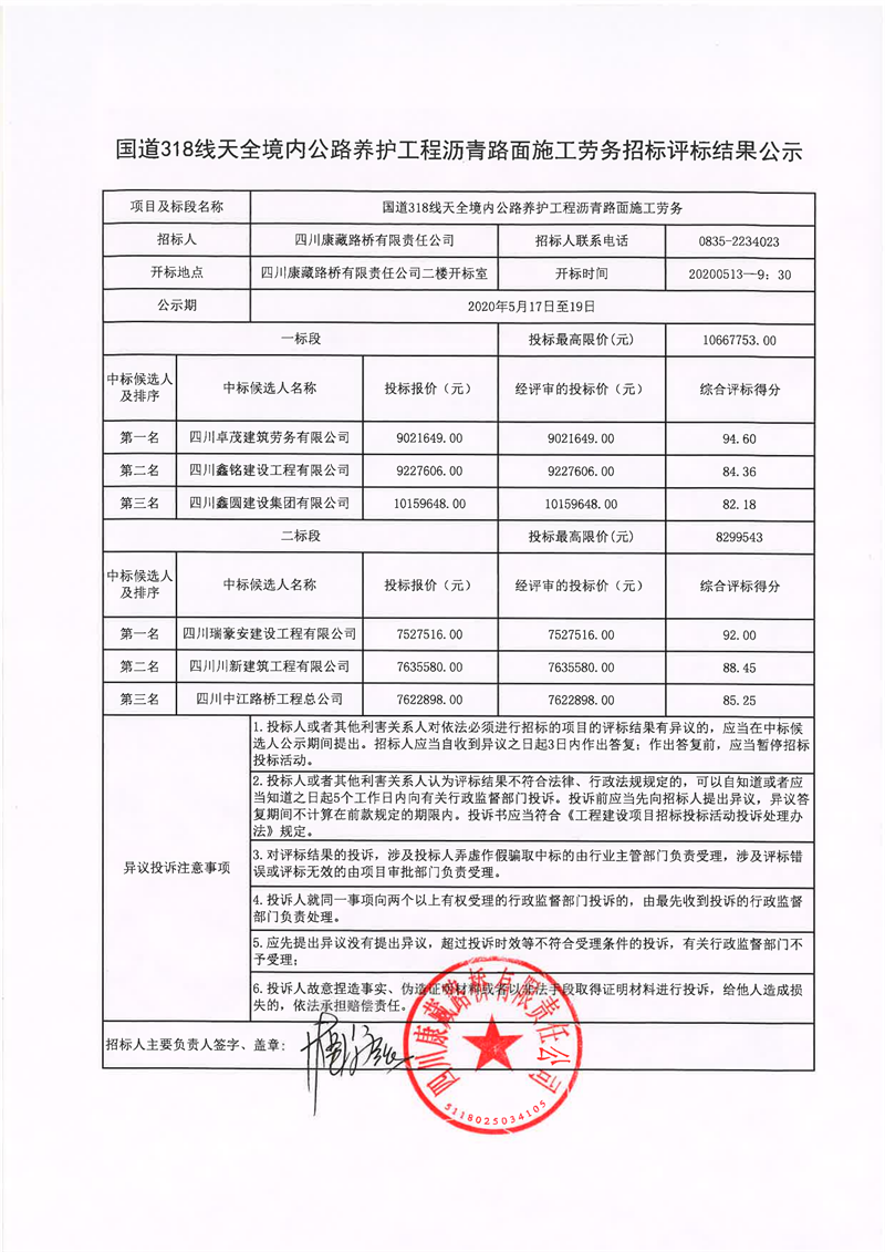 四川康藏路橋有限責任公司國道318線天全境內公路養(yǎng)護工程瀝青路面施工勞務招標評標結果公示