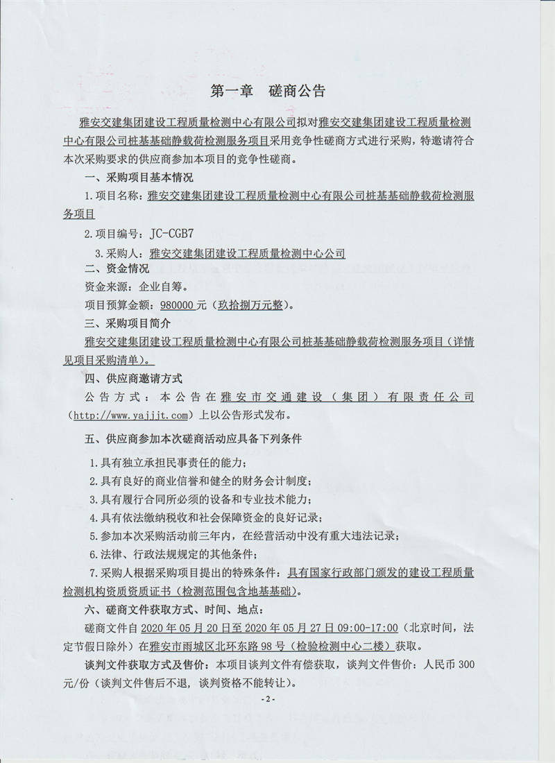 雅安交建集團(tuán)建設(shè)工程質(zhì)量檢測(cè)中心有限公司樁基基礎(chǔ)靜載荷檢測(cè)服務(wù)采購(gòu)項(xiàng)目競(jìng)爭(zhēng)性磋商公告