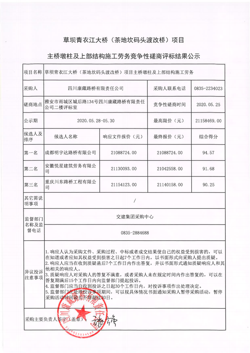 四川康藏路橋有限責(zé)任公司草壩青衣江大橋(茶地坎碼頭渡改橋)項目主橋墩柱及上部結(jié)構(gòu)施工勞務(wù)競爭性磋商評標(biāo)結(jié)果公示