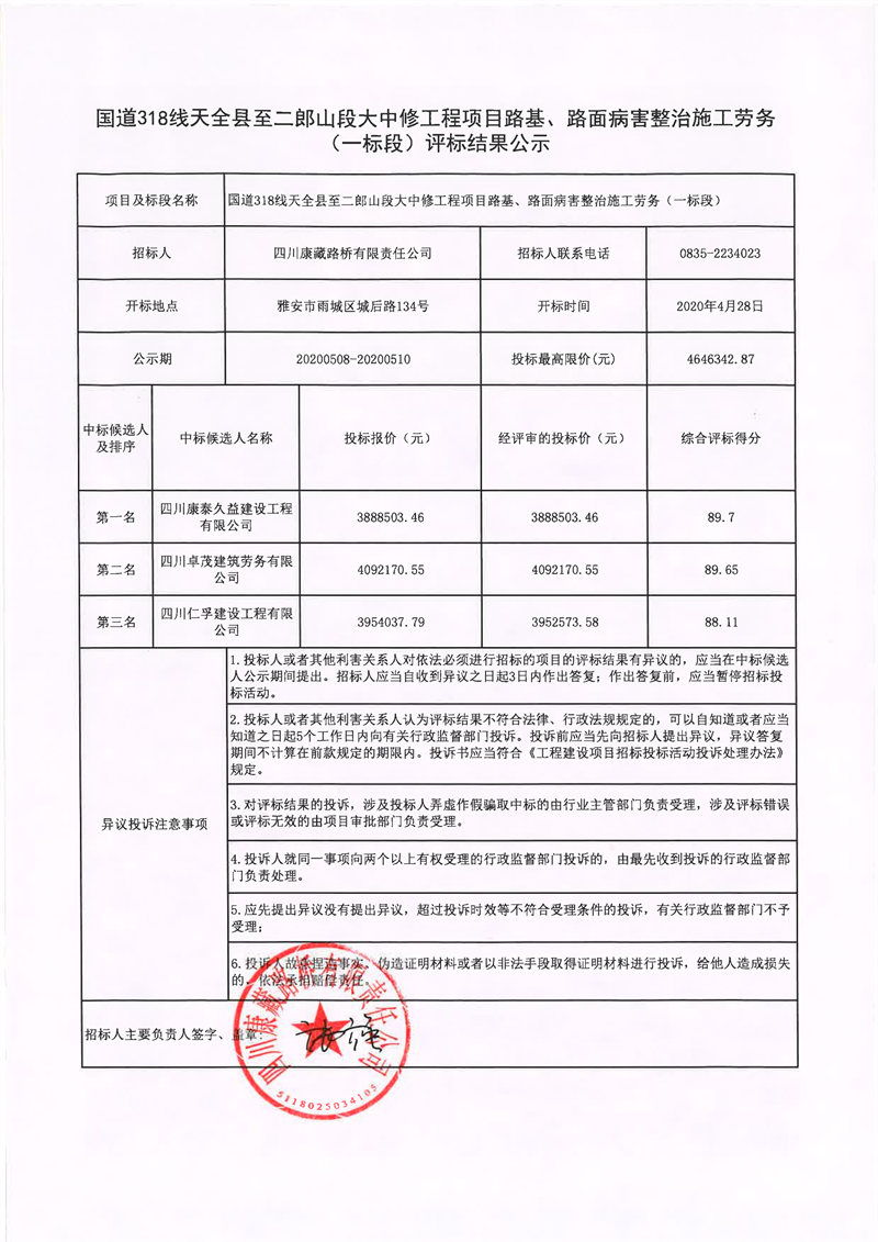 四川康藏路橋有限責(zé)任公司國(guó)道318線天全縣至二郎山段大中修工程項(xiàng)目路基、路面病害整治施工勞務(wù)(一標(biāo)段)評(píng)標(biāo)結(jié)果公示