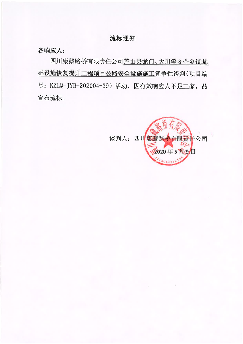 四川康藏路橋有限責任公司蘆山縣龍門、大川等8個鄉(xiāng)鎮(zhèn)基礎(chǔ)設(shè)施恢復(fù)提升工程項目公路安全設(shè)施施工競爭性談判流標通知