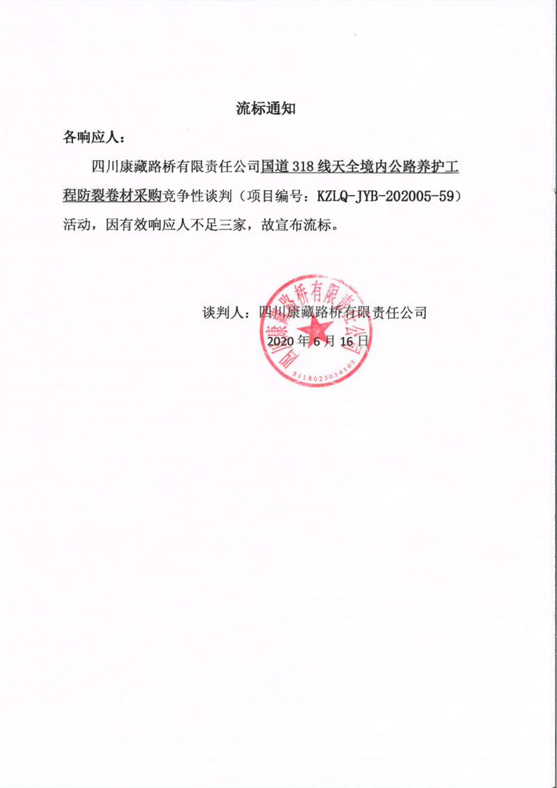 四川康藏路橋有限責(zé)任公司國道318線天全境內(nèi)公路養(yǎng)護(hù)工程防裂卷材采購流標(biāo)通知