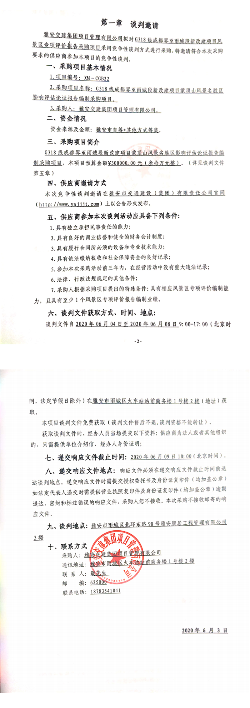雅安交建集團(tuán)項(xiàng)目管理有限公司G318線成都界至雨城段新改建項(xiàng)目蒙頂山風(fēng)景名勝區(qū)影響評估論證報(bào)告編制采購項(xiàng)目競爭性談判公告