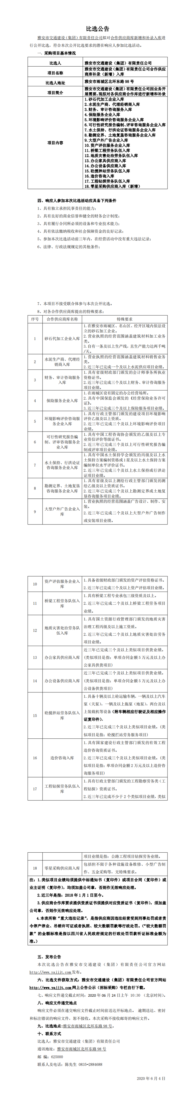 雅安市交通建設(集團)有限責任公司合作供應商庫補錄(新增)入庫比選公告