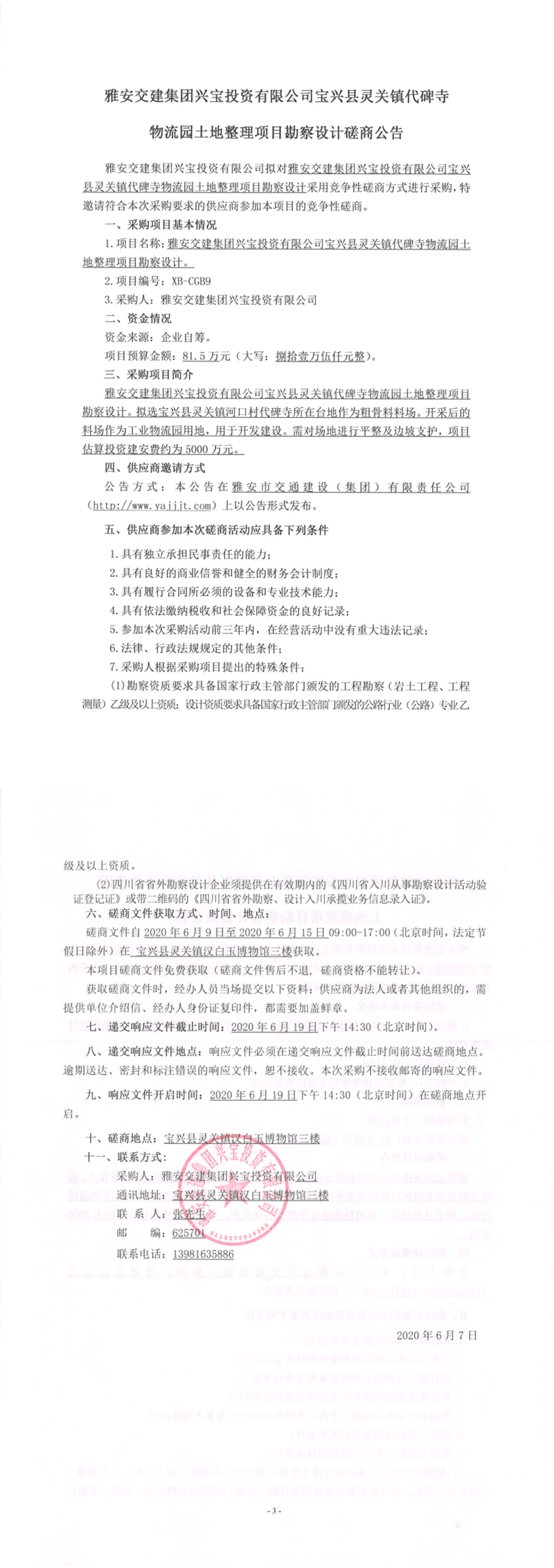 雅安交建集團興寶投資有限公司寶興縣靈關(guān)鎮(zhèn)代碑寺物流園土地整理項目勘察設(shè)計競爭性磋商公告