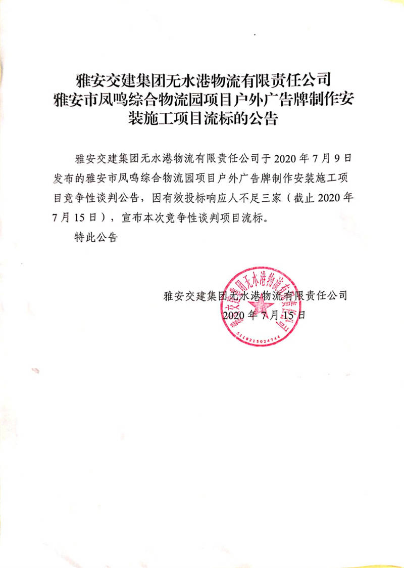 雅安交建集團(tuán)無水港物流有限責(zé)任公司雅安市鳳鳴綜合物流園項目戶外廣告牌制作安裝施工項目流標(biāo)公告