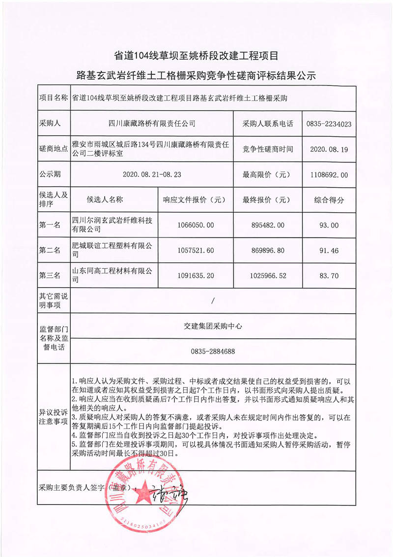 四川康藏路橋有限責(zé)任公司省道104線草壩至姚橋段改建工程項目路基玄武巖纖維土工格柵采購競爭性磋商評標(biāo)結(jié)果公示