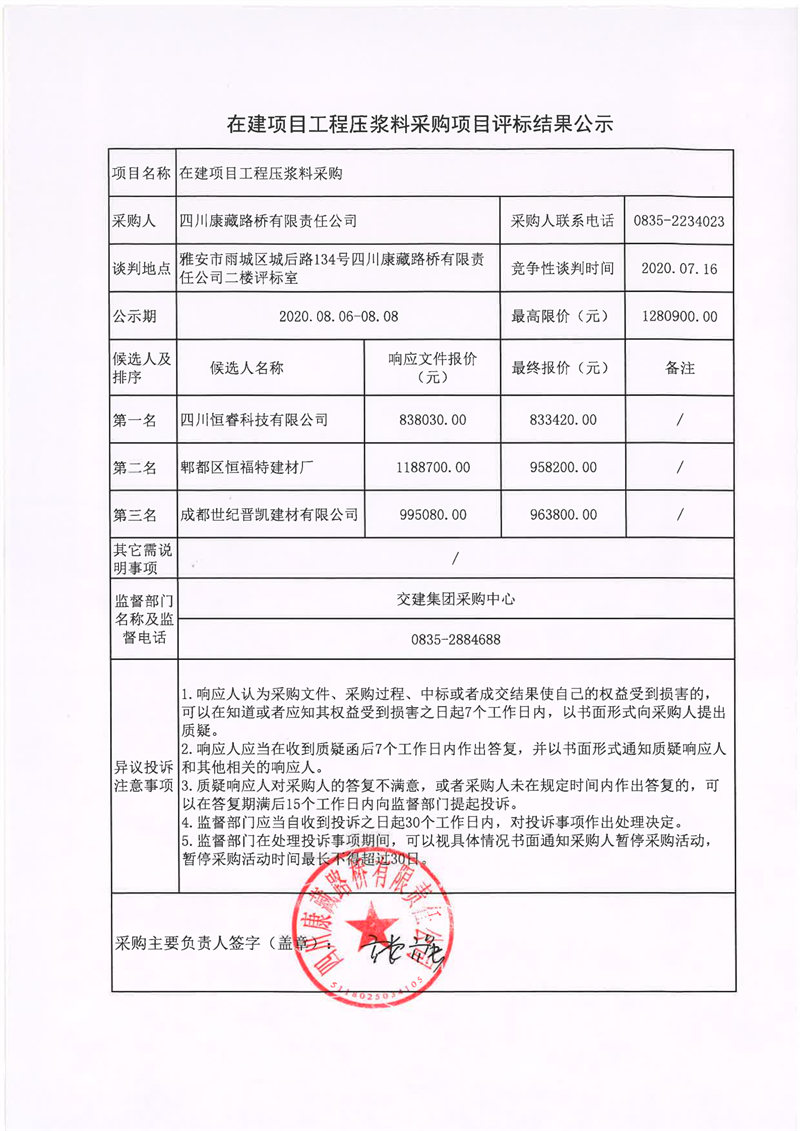 四川康藏路橋有限責任公司在建項目工程壓漿料采購評標結果公示